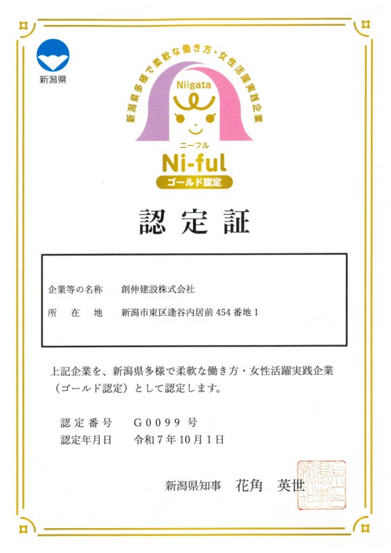 10月1日、新潟県知事政策局政策企画課様より、本年新設された「新潟県多様で柔軟な働き方・女性活躍実践企業(Ni-ful(ニーフル)認定企業)のゴールドに認定されましたことをお知らせいたします。「Ni-ful」とは新潟県の「Ni」、充実の「Full」等を組み合わせ「多様で柔軟な働き方や、誰もが充実した人生を送ることができる社会を目指す」意味が込められた制度となっています。ゴールド認定を励みに、社員一人ひとりが能力を最大限に発揮し、充実して働ける職場環境づくりに、より一層真摯に取り組んでまいります。
